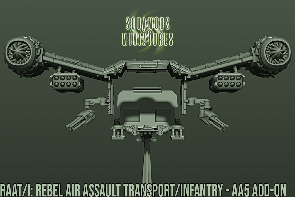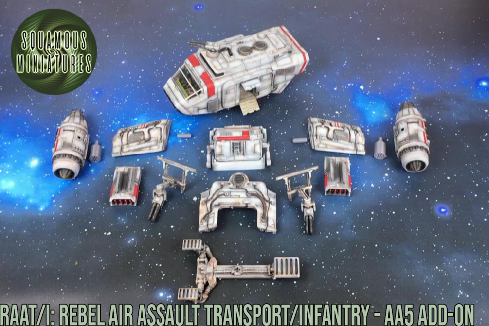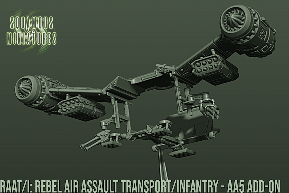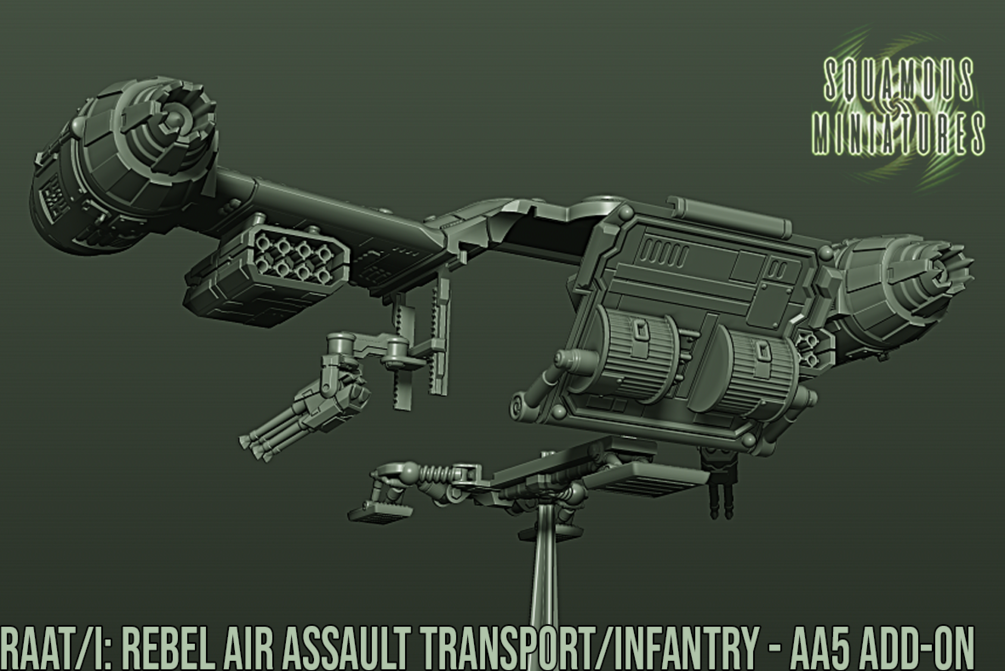 Expand your Star Wars Legion options with this STL add-on for the AA5 which turns it into the formidable Rebel Air Assault Transport/Infantry or RAAT/i. Able to clear any drop site and defend itself with its twin AG-2G Quad Laser sponsons and Zann rocket pods.