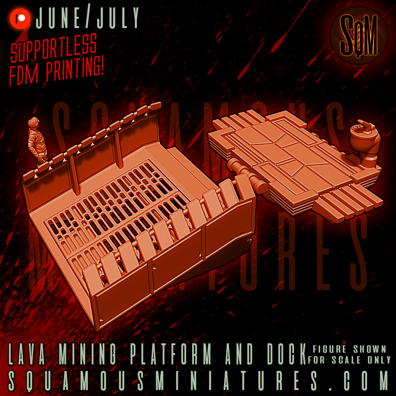 Straight from my Patreon comes the Lava Mining Platform and Docks. Used by the workforce during the day (if there is daytime on this choked-up ash-ball of a planet) the Lava Mining Platform skims over the surface of the lava flow so the extraction of certain elements can be achieved. During the night, it makes the perfect vehicle for the Guerrillas to silently glide their way across the lava chasm towards their target. It also comes with a dock, for loading and unloading and crazy stuff like that.