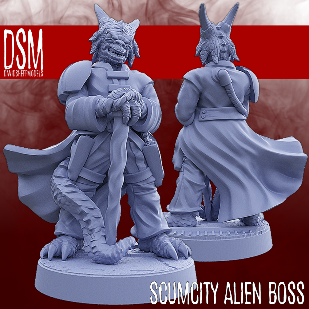 ScumCity Alien Boss - is scaled at 28mm Heroic Scale (proportioned like Citadel Miniatures' new Cadian Shock Troops). This is sculpted to be printed on resin printers, and come with a sculpted, themed 25mm base, and pre-supported versions of everything.
