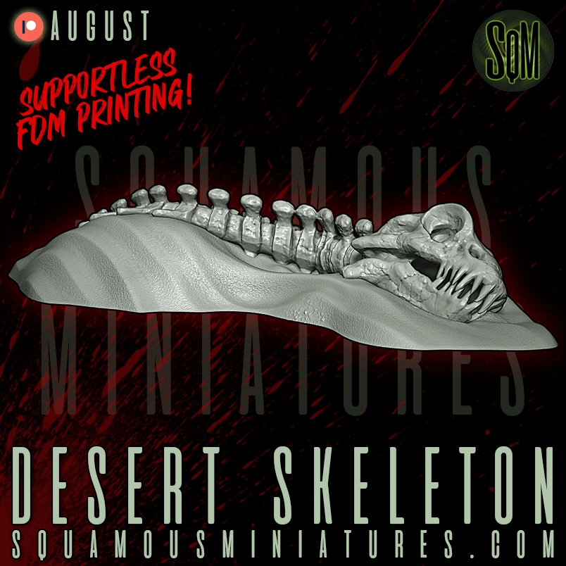 Straight from August's Patreon comes the Desert Skeleton. The final resting place amongst the dunes, of a once mighty creature, its bones have since been picked clean and bleached by the dual suns of a hostile planet. It does make a good landmark, that is often used by nefarious gangs as a meeting place and drop-off point for illegal substances.