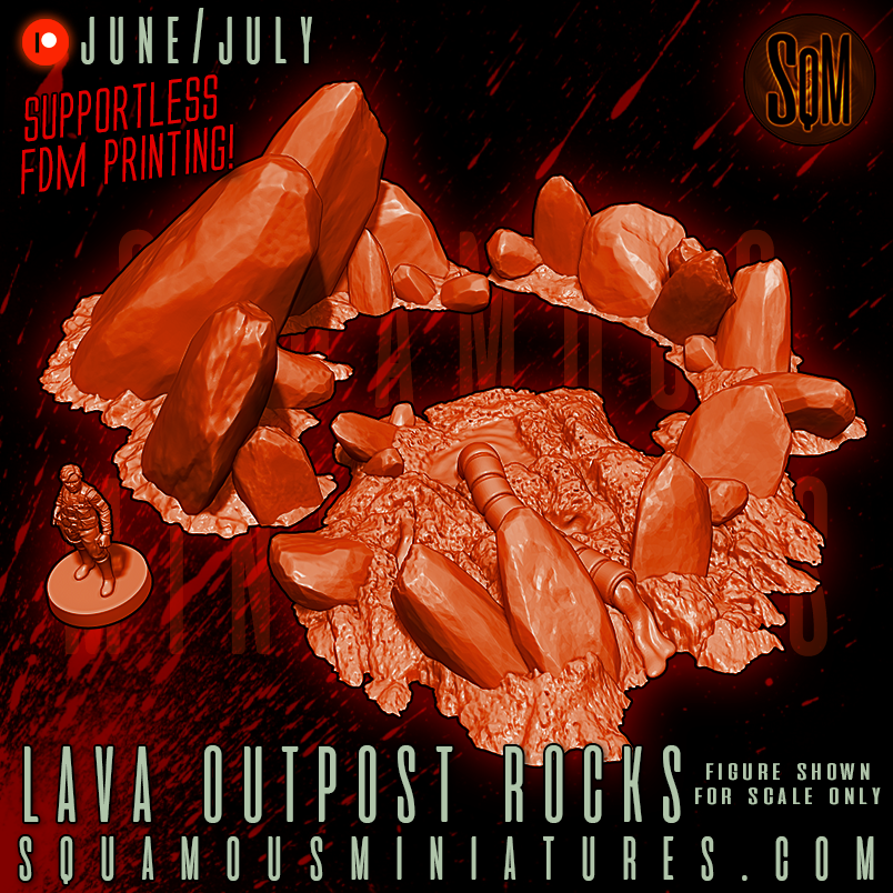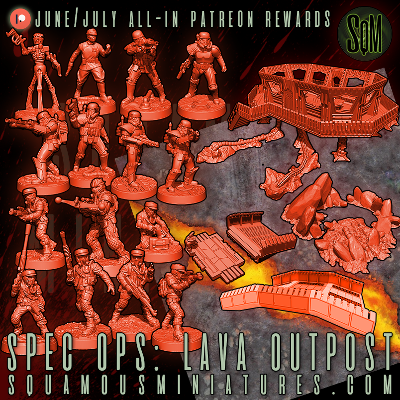 The Lava Outpost Raid Complete collection is everything you need to have a 3'x3' games table full of terrain and figures. Great for special operations games and covert missions. Also includes the bonus Magma Tick and Rider, and Lava Outpost Footbridge and Barricade. This was originally released on my Patreon during June and July 2023.
