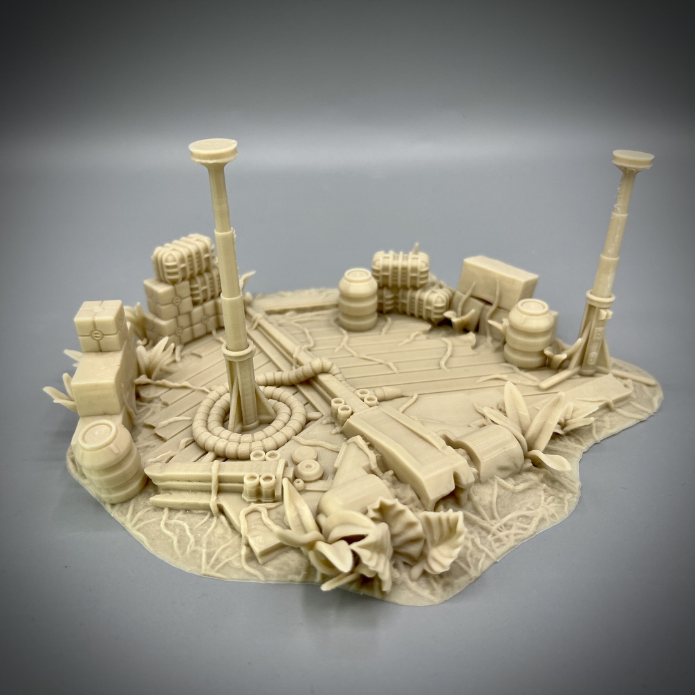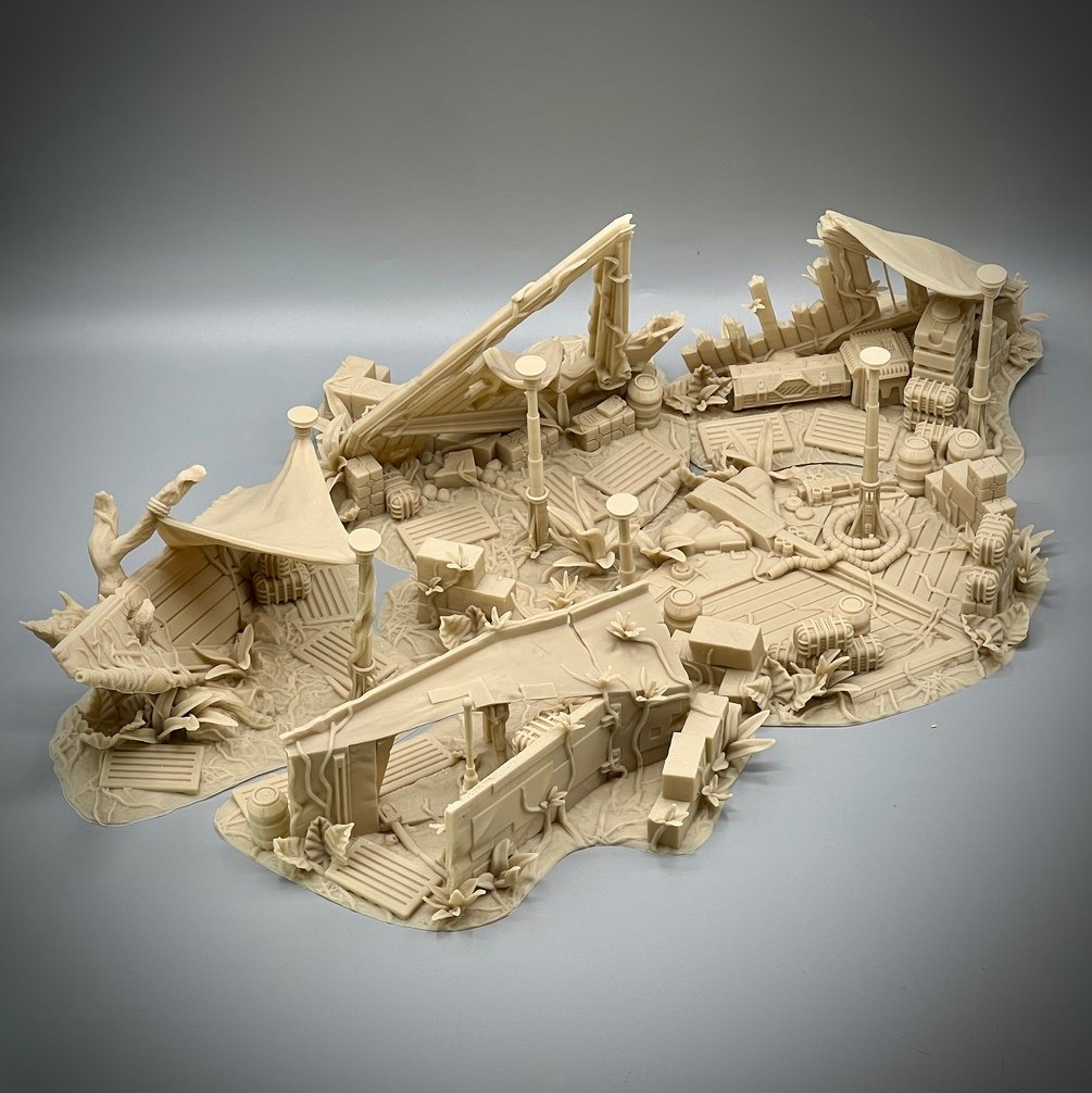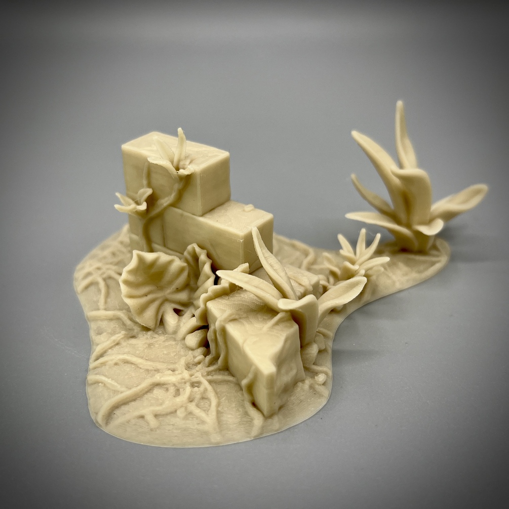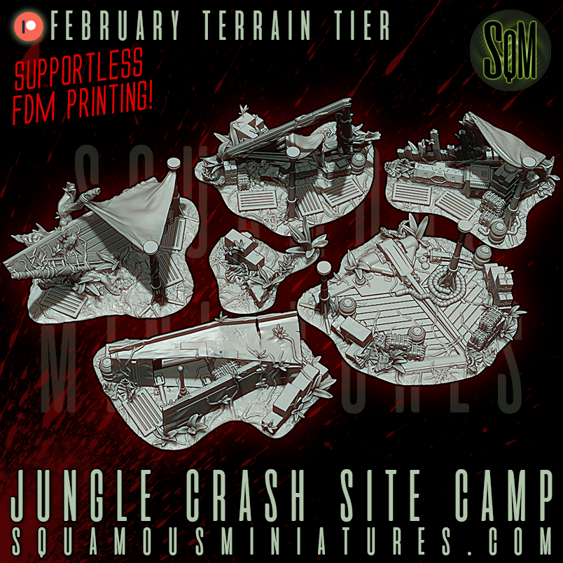 Straight from February's Patreon comes the Jungle Crash Site Camp. You get six jungle themed terrain pieces, which can be placed together These all print without the need for supports on an FDM printer. I test printed it on an Ender 3 v2 at 0.12mm layer thickness with a 10% line infill. They will fit on a printer with a 180mm x 180mm bed, like the Prusa mini, and up. This is specifically for FDM printers, and resin printing of this stuff is not supported in any way, you are on your own if you want to give it a try.