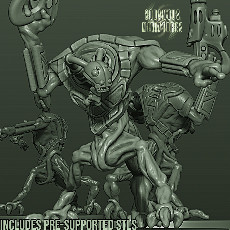 2 STL files of a Rezurex Foot Soldier Officer. The Rezurex have the head of a lesser creature attached to a genetically engineered body, by their mysterious masters. He is pointing towards the enemy, as these officer types are wont to do. One file comes with supports.