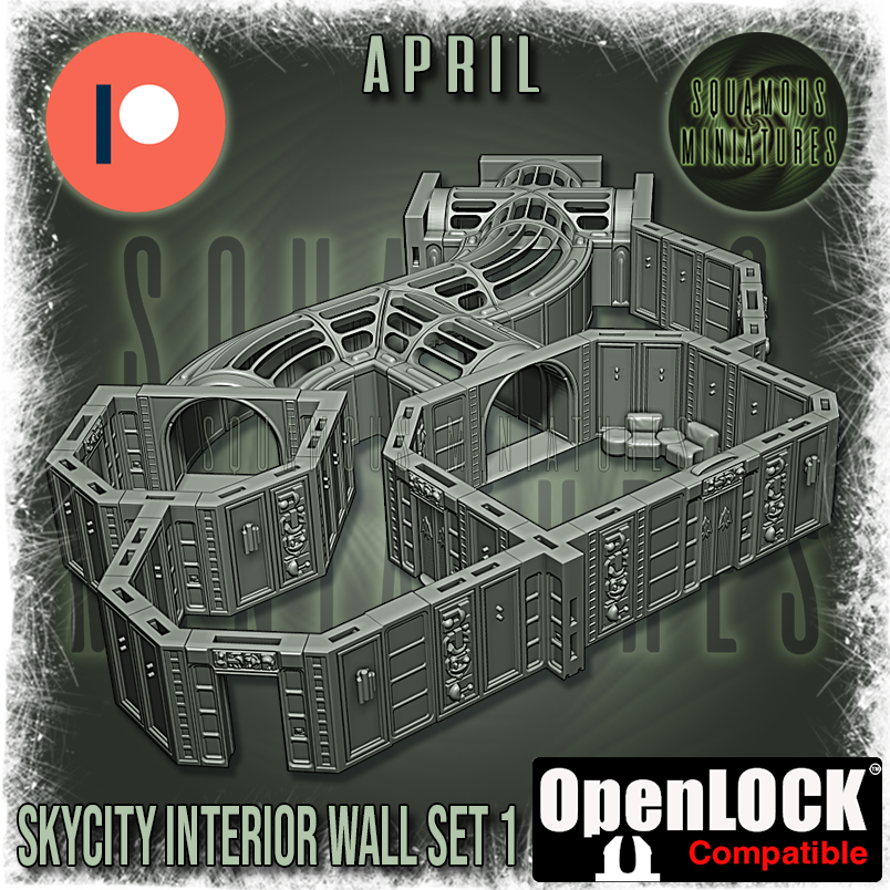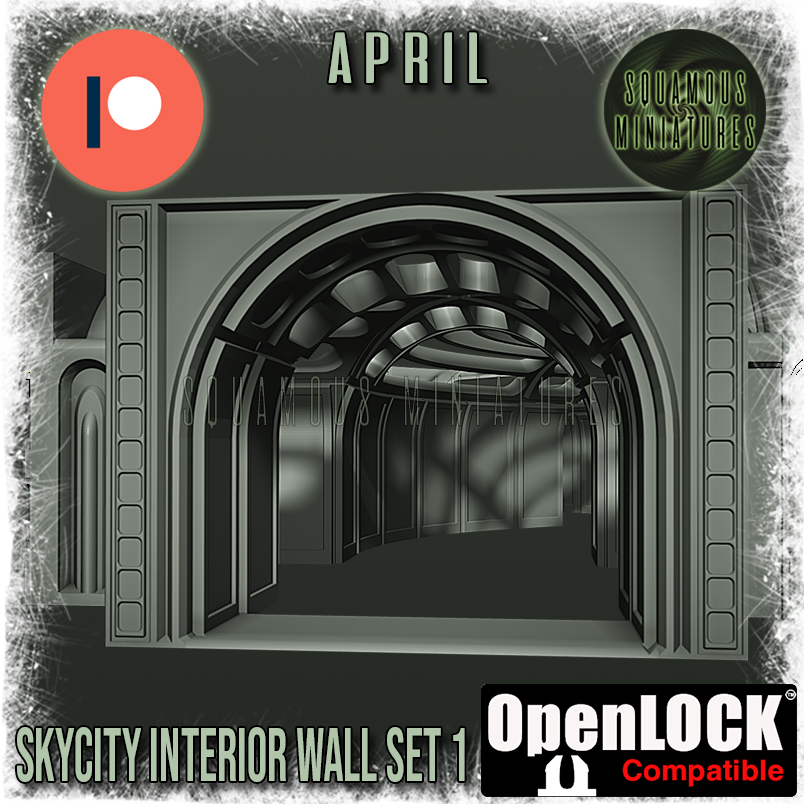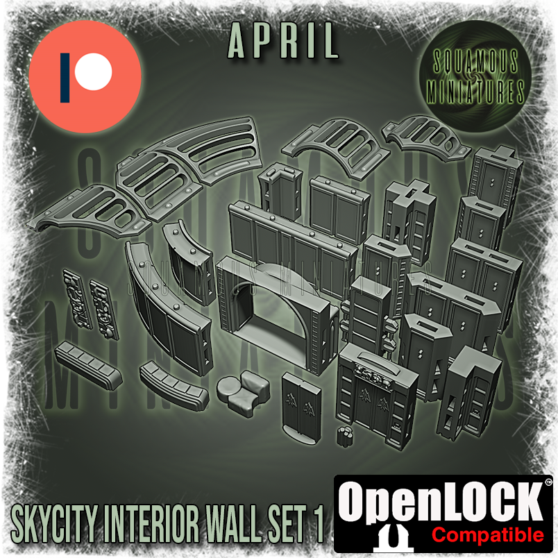 Straight from April's Patreon comes this SkyCity Interior Wall Set 1. This set contains 42 parts and an OpenLOCK clip that connects all the parts together with a satisfying click. It uses the OpenLOCK system by printablescenery.com, like all my SkyCity Terrain, and the Arctic stuff too. There are going to be plenty of new expansions out on my Patreon, like this, and the whole set will build into something varied and huge when they come to my Gumroad store.