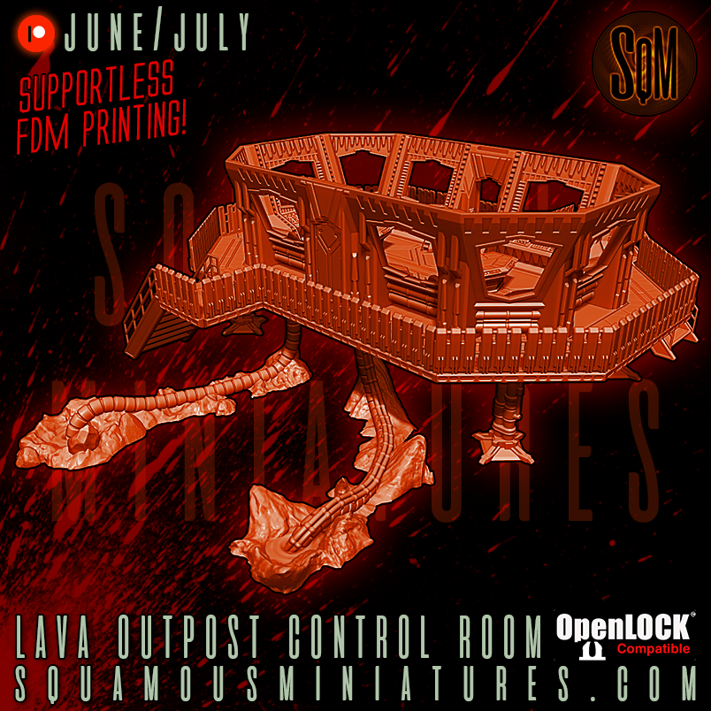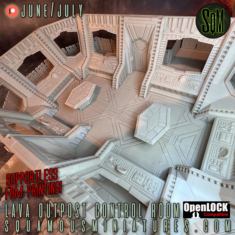 Straight from my Patreon comes the Lava Outpost Control Room. This is OpenLOCK compatible (OpenLOCK is copyright of printablescenery.com) and comes in 43 parts with which you can make a myriad of set-ups. You can make the set you see in the pictures, or a number of smaller or larger ones, I haven't had time to explore all the possibilities yet, but I bet there is a lot. You can even use the floor without the walls as a huge landing pad, for when high ranking officials (who need assassinating) are visiting for inspections and such, or shipments of stuff (that need blowing up) are arriving and leaving. It's a big set with lots of possibilities, and it was very nice to make. It all prints without supports, and I've orientated everything for simple set up in Cura or your chosen slicer program.