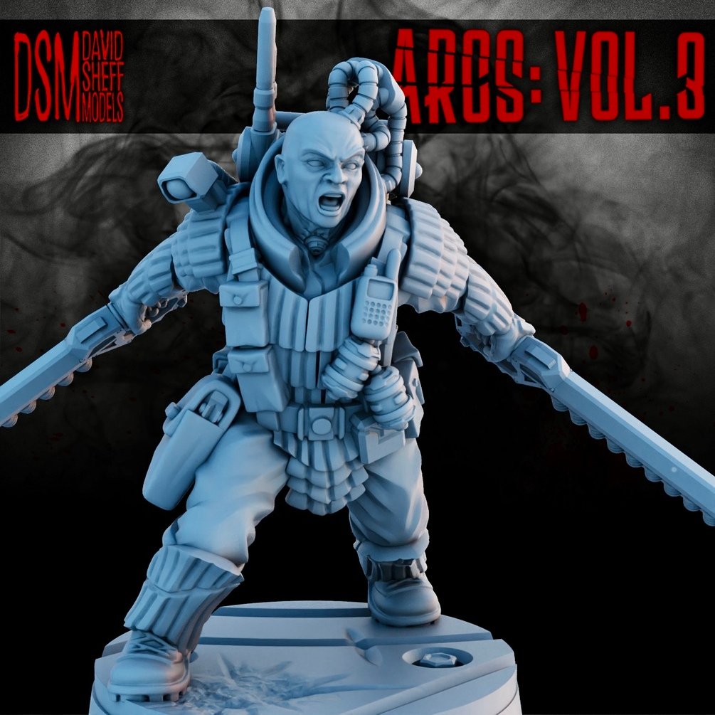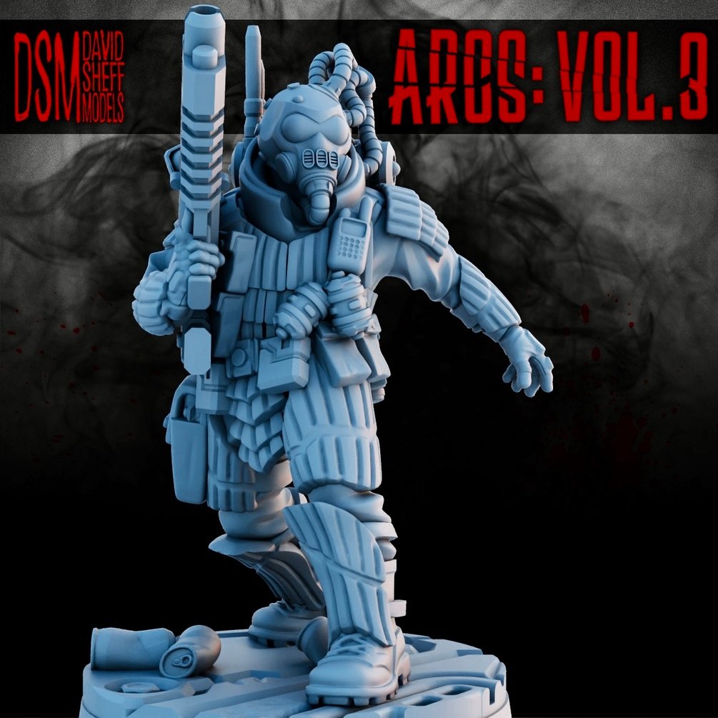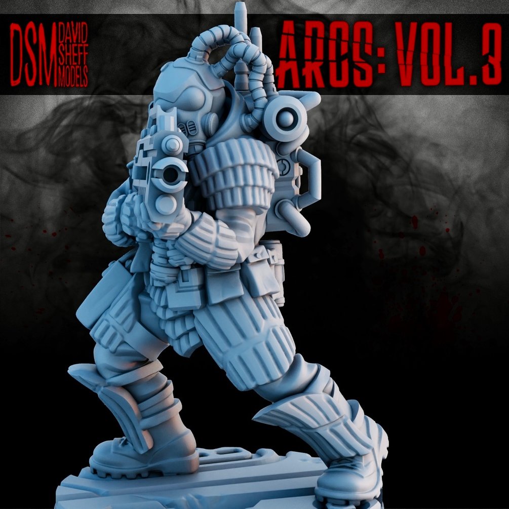ARCS CORPORATION SECURITY from my ARCS: Vol.3 3D PRINTABLE SCI-FI Miniature Kickstarter campaign, found here: https://www.kickstarter.com/projects/catnippnipper/arcs-vol3-3d-printable-sci-fi-miniatures