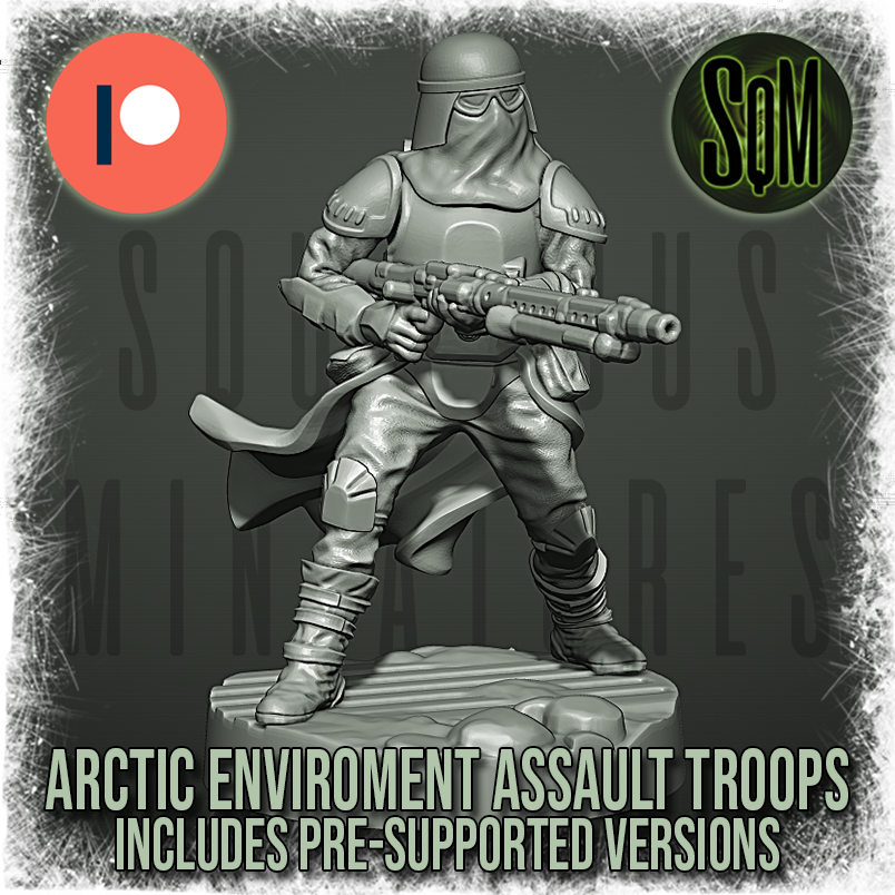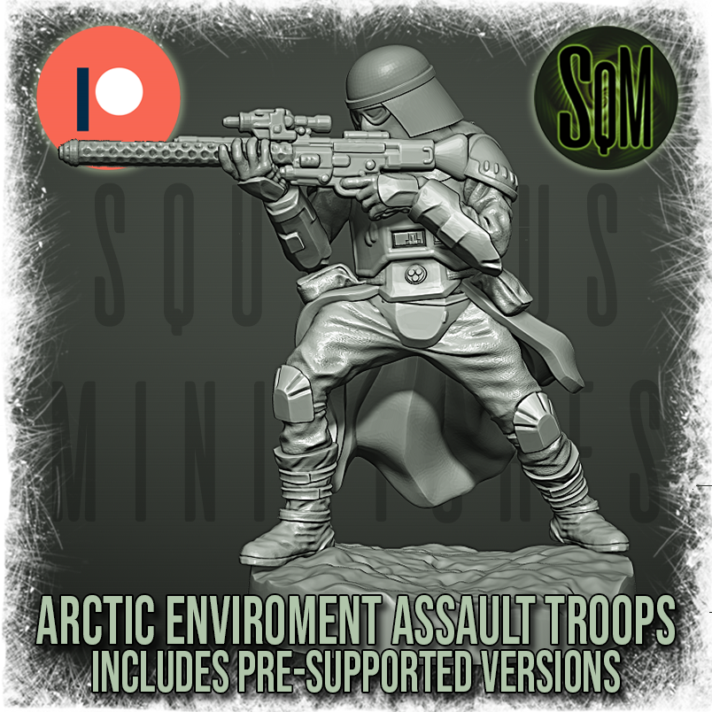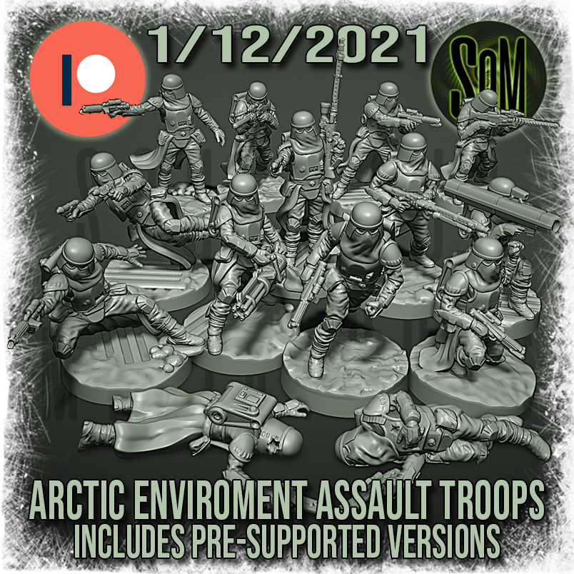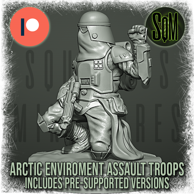In this multipack you get Arctic Environment Assault Troopers Pack 1 and 2, Special Agent AEATroopers, and Dead AEATroopers. That's 16 figures in total. You also get bases for all the ones still alive, and pre-supported versions of everything. It's all the figures from my December Patreon, 60 STLs in total.